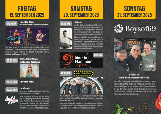 Besucherinnen und Besucher dürfen sich auf eine bunte Auswahl an Foodtrucks mit internationalen Spezialitäten, Streetfood-Klassikern und süßen Leckereien freuen. Ob saftige Burger, herzhafte Käsespätzle, vegetarische und vegane Köstlichkeiten oder süße Versuchungen – die Vielfalt lässt keine Wünsche offen. Dazu sorgen erfrischende Drinks und die besondere Rheinatmosphäre für das passende Festival-Feeling.