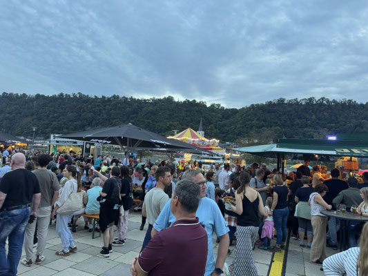 Der Samstag startete wieder mit grandiosem Sonnenwetter! Bei fast 30 Grad fanden sich sehr viele Gäste auf dem Loreleyplatz ein. Die Foodtrucks hatten gut zu tun. Es gab ellenlange Schlangen an den Foodtrucks. Auch die Weinhändler hatten ihre Liebhaber.