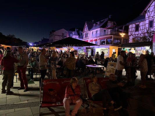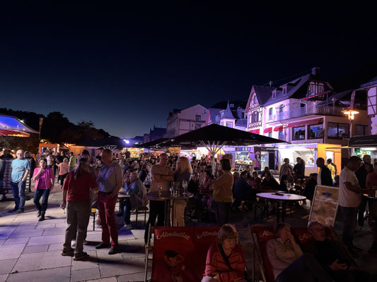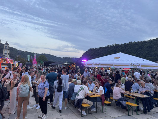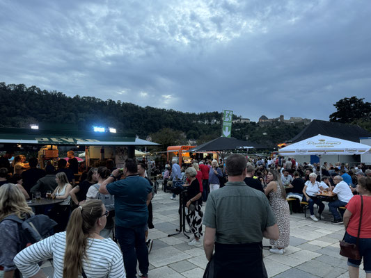 Der Samstag startete wieder mit grandiosem Sonnenwetter! Bei fast 30 Grad fanden sich sehr viele Gäste auf dem Loreleyplatz ein. Die Foodtrucks hatten gut zu tun. Es gab ellenlange Schlangen an den Foodtrucks. Auch die Weinhändler hatten ihre Liebhaber.