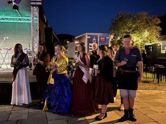 Gegen Abend war der Platz gut gefüllt und die offizielle Eröffnung begann, mit ein paar Minuten Verzögerung, gegen 20.10 Uhr. Die eingeladenen Gäste aus nah und fern wurden von der Loreley Katharina und Stadtratsmitglied Heinz-Peter Mertens begrüßt. Unter den eingeladenen Ehrengästen waren, der 1. Beigeordneten Holger Puttkammer von der VG Loreley, der 2. Beigeordneten der Loreleystadt St. Goarshausen Harald Steil, Stadtbürgermeister Falko Hönisch und dessen 1. Beigeordnete Pia Trimpe-Müller aus der Schwesterstadt St. Goar, sowie Anke Sorg, die 1. Beigeordnete aus der Stadt Nastätten. Unsere Loreley Katharina begrüßte die Repräsentanten der Region.